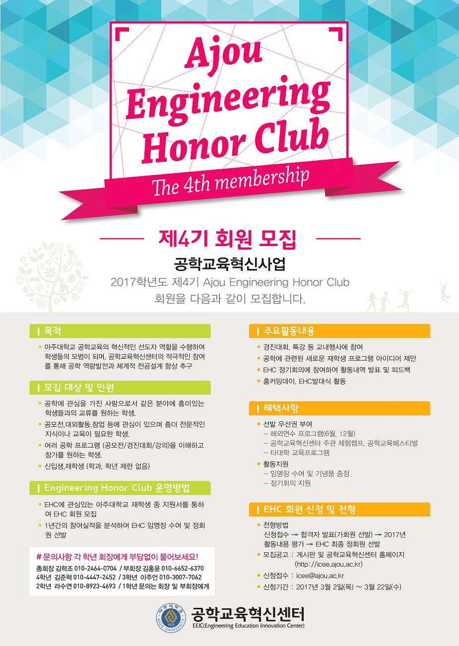 [공학교육혁신센터] Ajou Engineering Honor Club (EHC) 제 4기 회원 모집 + 개강총회 안내